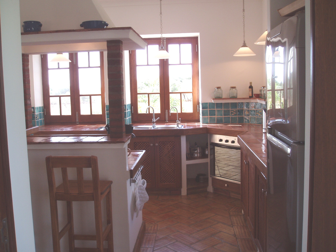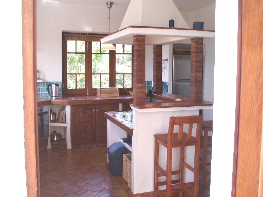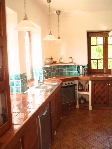 Die Kücke ist geräumig und perfekt ausgestattet mit Backofen, Elektroherd in der Mitte, Geschirrspülmaschine, Kaffeemaschine, Kühl und Gefrierschrank, Wassersieder, Orangensaftpresse und vieles mehr. Vom Südfenster hat man Meerblick, und es gibt zu den beiden überdachten Terrassen im Süden und Westen einen Zugang.