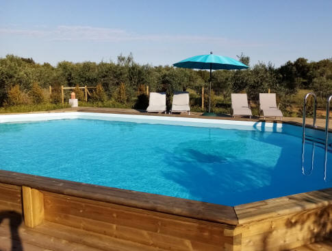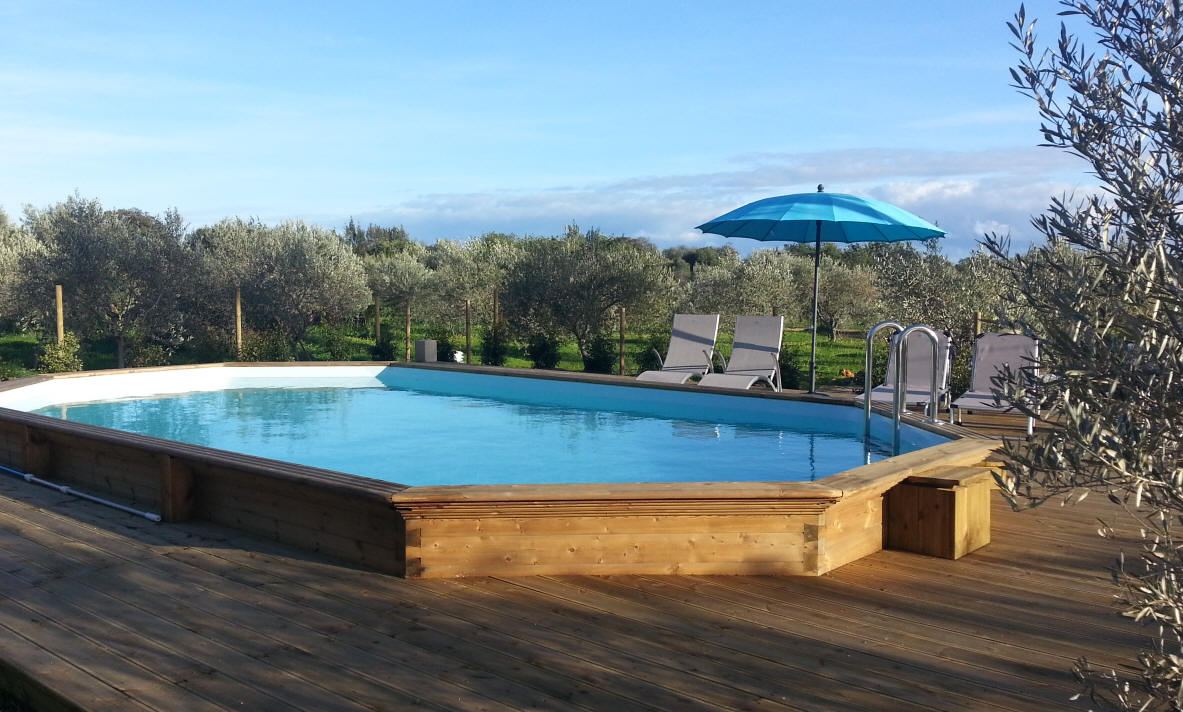 Der 2019 erbaute Pool ist umgeben mit einem Holzdeck der zum Liegen einlät und ist zur Sicherheit eingezäunt.