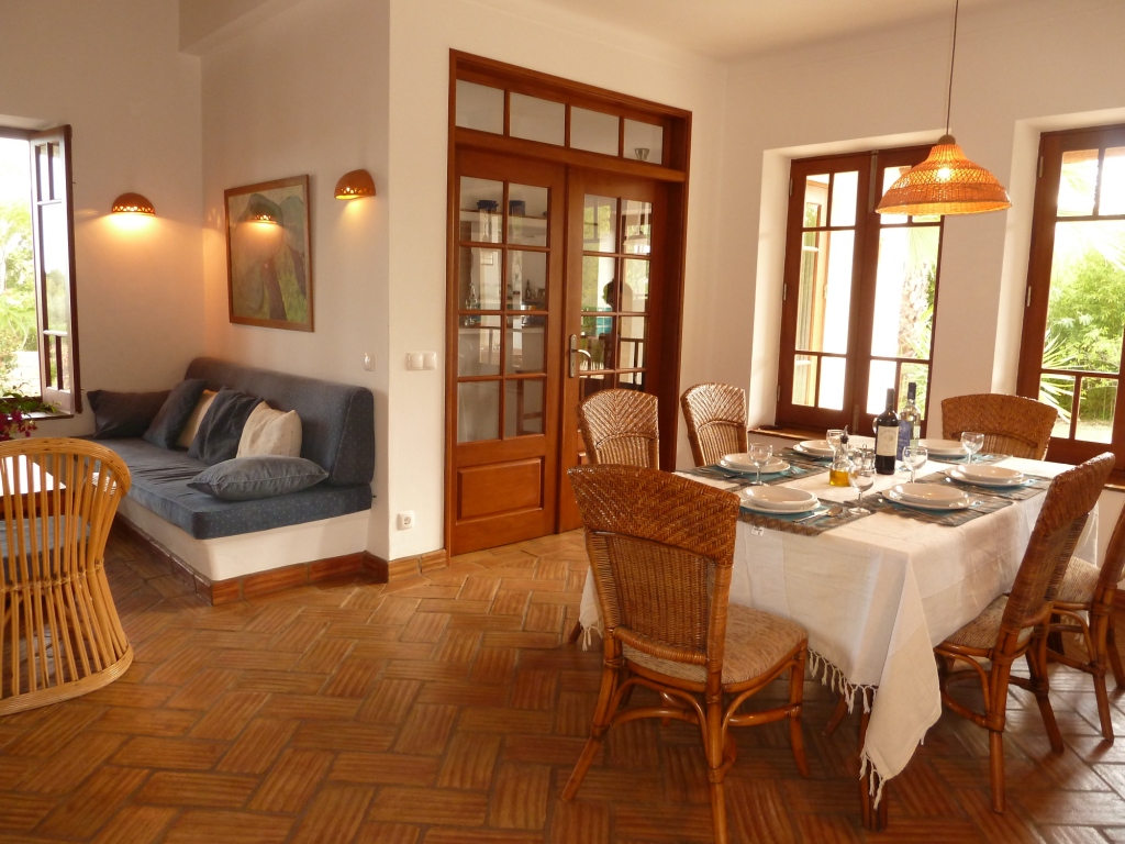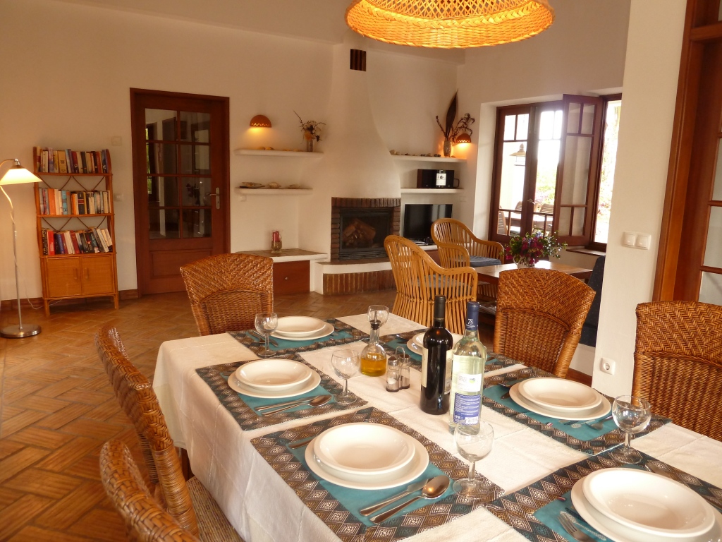 Das Wohnzimmer ist sehr groβzügig und gemütlich, mit einem typisch portugiesischen "Cana und Pau" Dach (Eukalyptus und Bambus). Es hat einen Essbereich mit einem Esstisch für 6-10 Personen und einen Wohnbereich mit Sofa, das auch als Schlafplatz benützt werden kann. Ein Kaminofen sorgt für angenehme Wärme